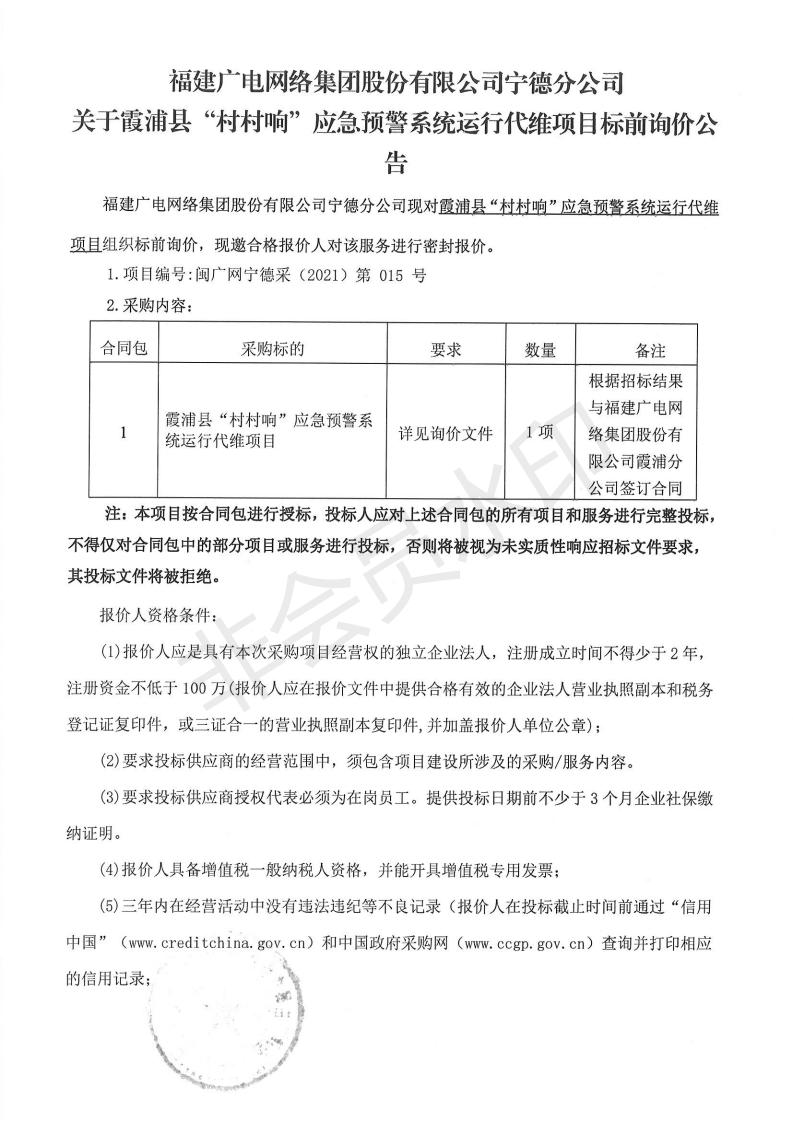 霞浦縣“村村響”應急預警系統運行代維項目標前詢價公告